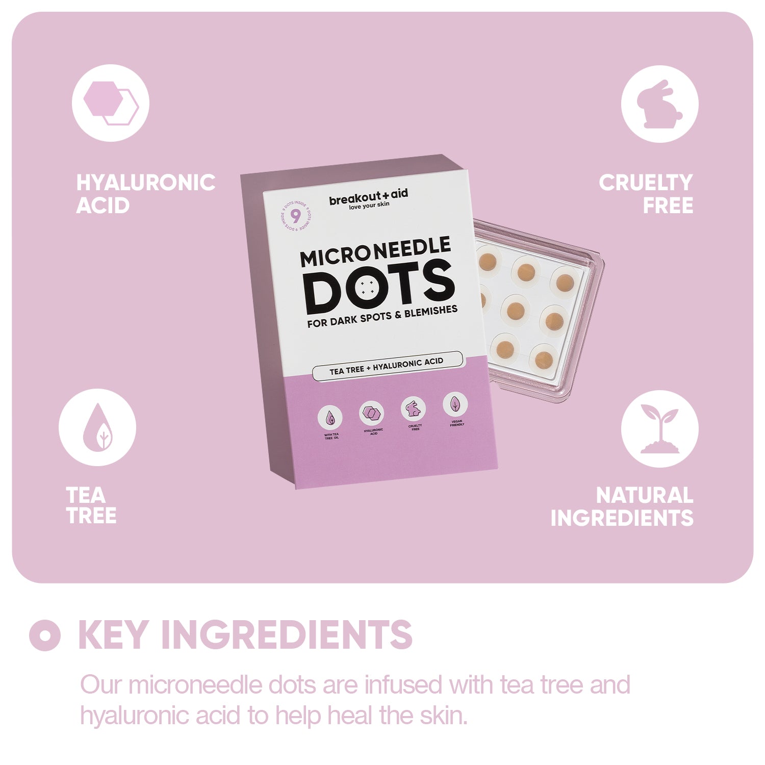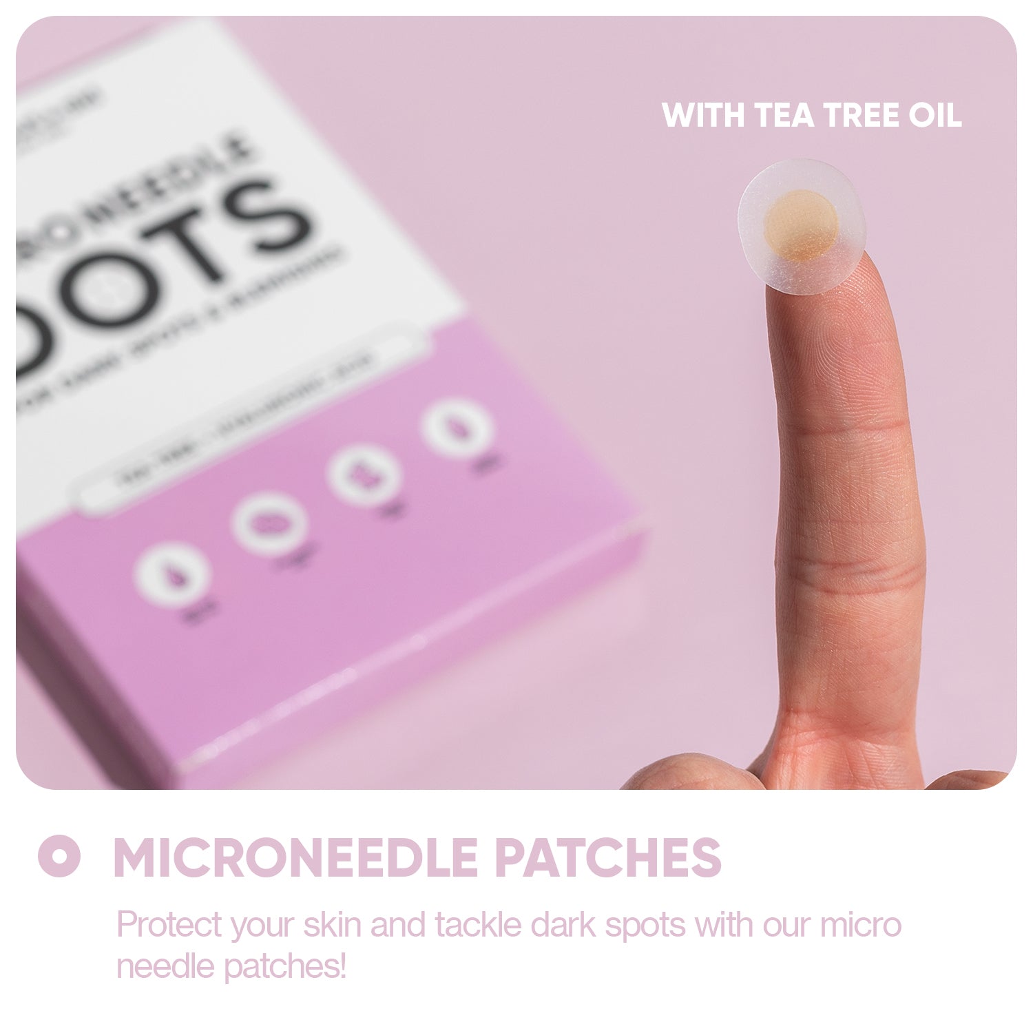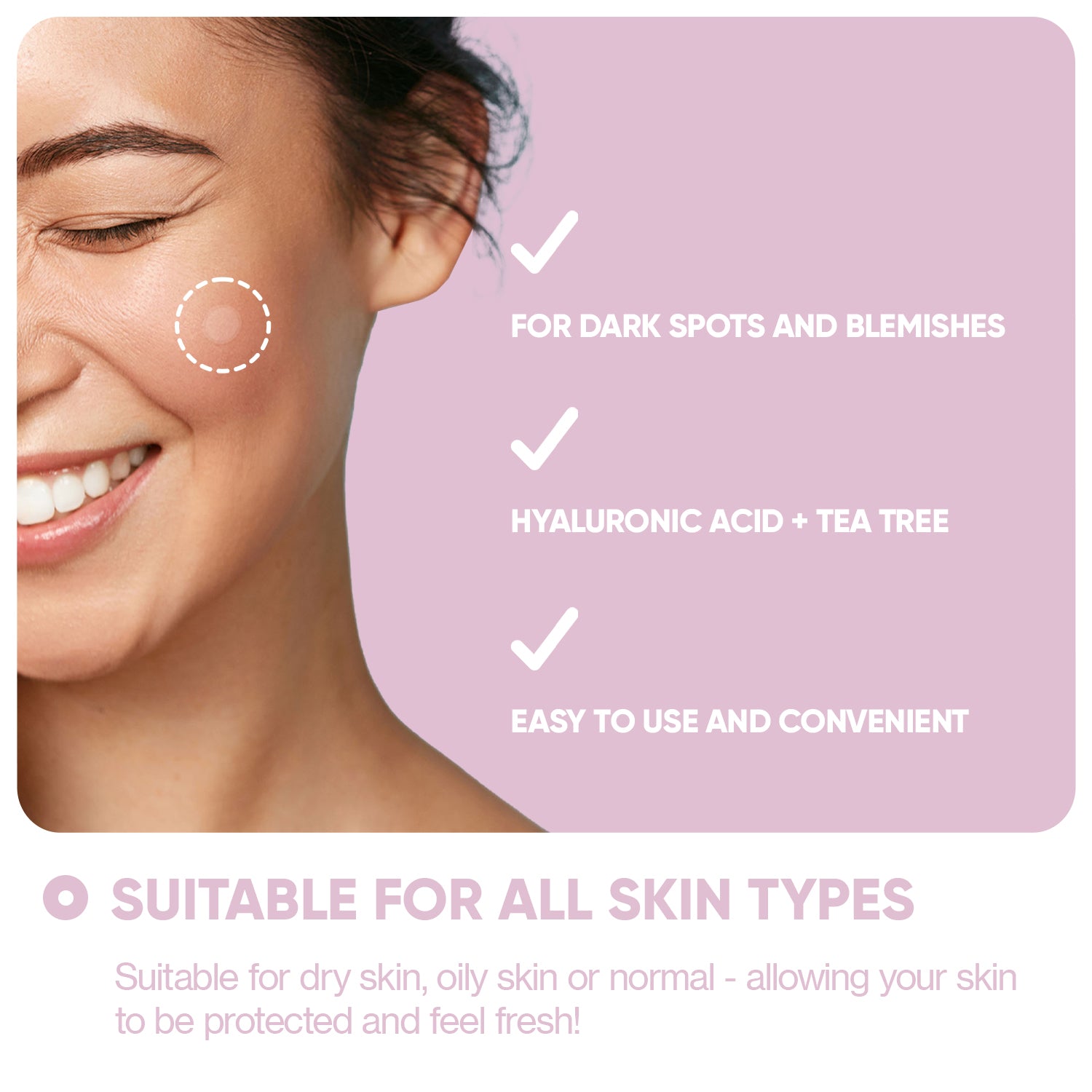 9 micro-needle dots in total. Say hello to our Our Micro Needle Patches for Dark Spots infused with Tea Tree Oil & Hyaluronic Acid. Dive into the healing embrace of nature with our revolutionary micro needle patches, your new ally in the battle against ark spots and blemishes.