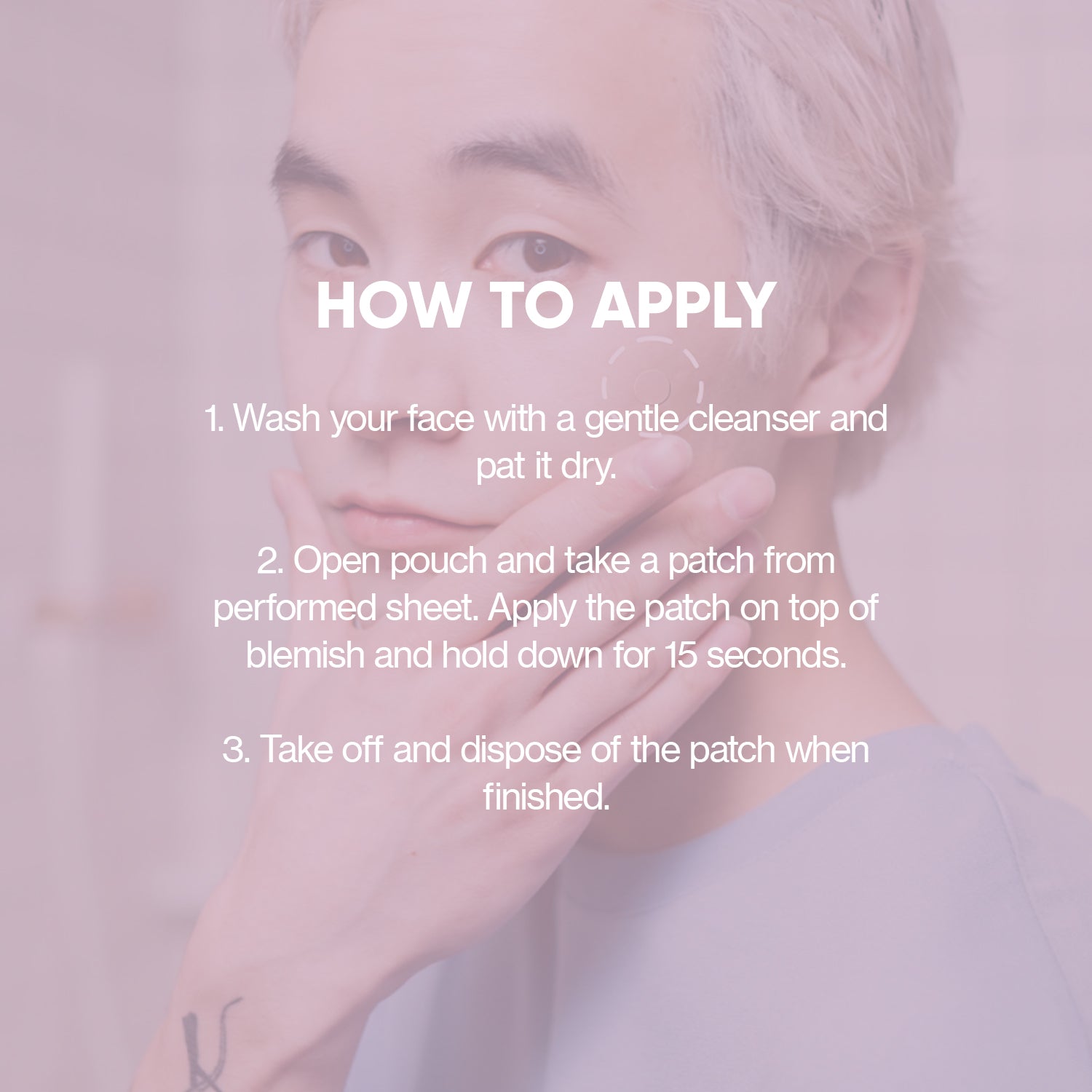 2. Open pouch and take a patch from performed sheet. Apply the patch on top of blemish and hold down for 15 seconds.